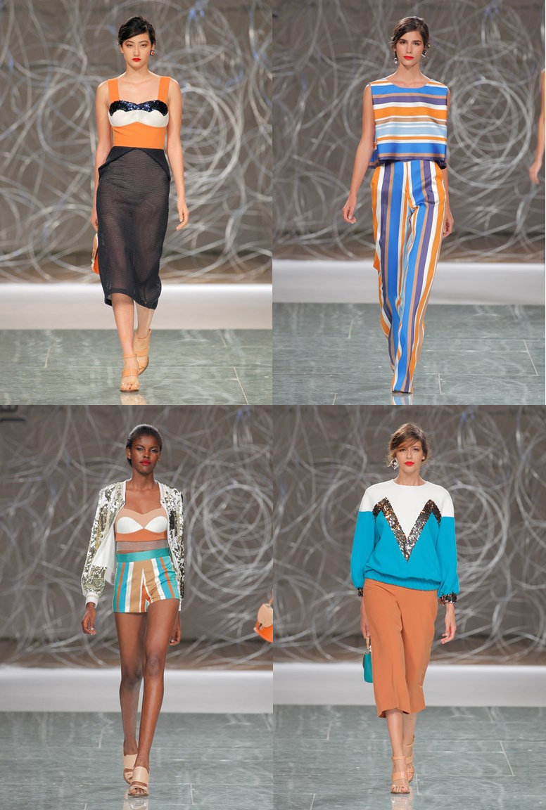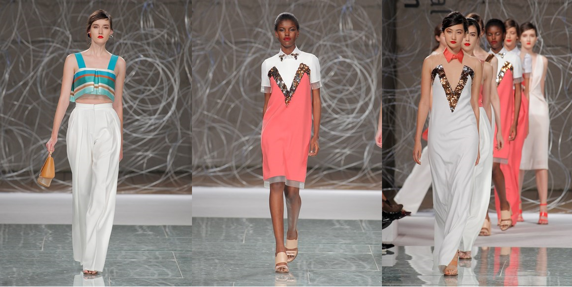 Nos tons azul turquesa, laranja, branco, camel, salmão, preto e branco; esta coleção foi pautada pelo relembrar dos anos 50. Saias rodadas, bermudas, corpetes e muitas formas geométricas. Adorei várias peças mas em baixo deixo-vos algumas fotos das minhas peças favoritas.