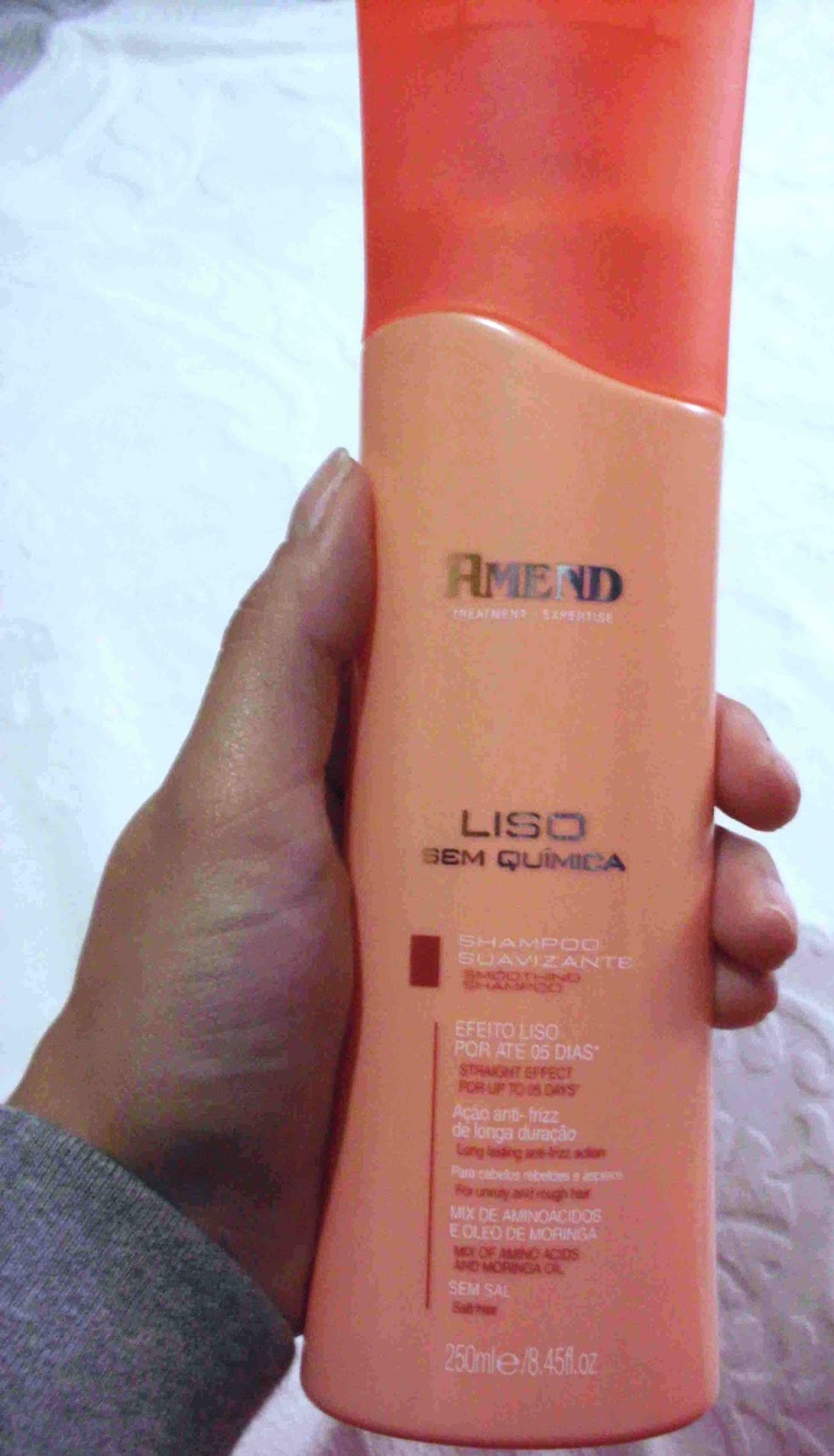 Há uns tempos fui à Pluricosmetica à procura deste shampoo da marca brasileira Amend cujo objetivo deste shampo, denominado "Liso Sem Quimica", era prometer com um mix de aminoácidos,- moléculas que formam as proteínas- e óleo de moringa, reparar a superfície capilar, o combate do frizz, nutrir e garantir o efeito liso até 5 dias.